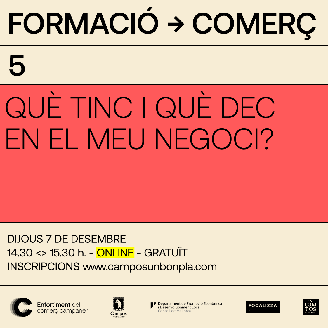 Aquesta sessió s'orientarà a donar eines de mesura i control respecte al balanç econòmic dels comerços de Campos. També servirà per conèixer eines perquè els comerços aprenguin a estructurar la informació sobre la seva situació econòmica.